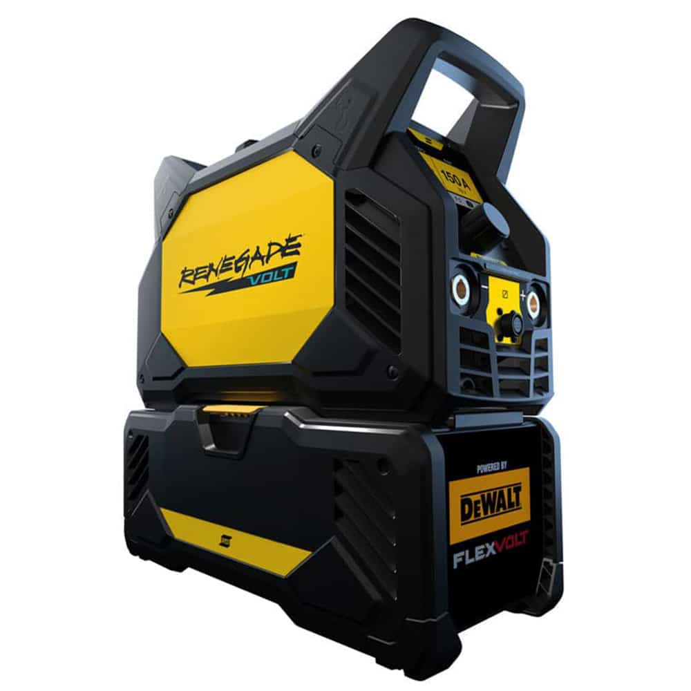 The ESAB® Renegade Volt™ ES 200i is a 200 amp portable DC Stick/TIG welder that operates on 120/230 volt input power AND 80 volt battery power. The Renegade Volt comes complete with four DeWalt® FlexVolt® 12 Ah batteries that produce up to 140 amps of stick welding output, which is ideal for electrodes up to 1/8 inch in diameter. When plugged into the wall, the Volt supplies up to 200 amps of weld current. Triple voltage technology allows the Volt ES 200i to operate on single-phase 120 volt or 230 volt input power using included adapter plug AND 80 volt battery power. In battery mode, the Volt can burn up to thirty three 3/32″ diameter E6013 electrodes on a single charge. In AMP+ Hybrid Mode, Renegade Volt supplements AC input power with battery power to prevent nuisance trips to the breaker box to reset smaller breaker sizes (e.g., 10A, 16A), or to provide more output when welding on 120V input.