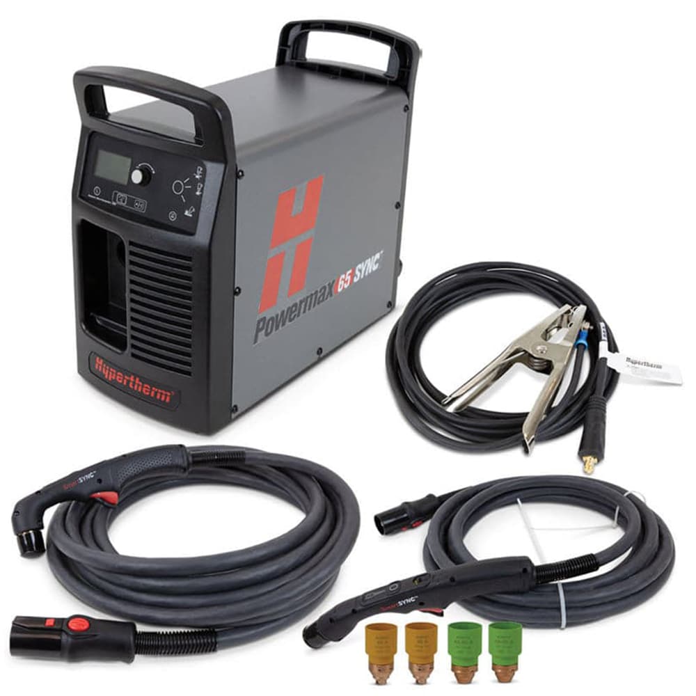 The Hypertherm® Powermax65 SYNC®, with 75 and 15 degree SmartSYNC™ handheld torches, is a complete 65 amp plasma cutting and gouging package.
