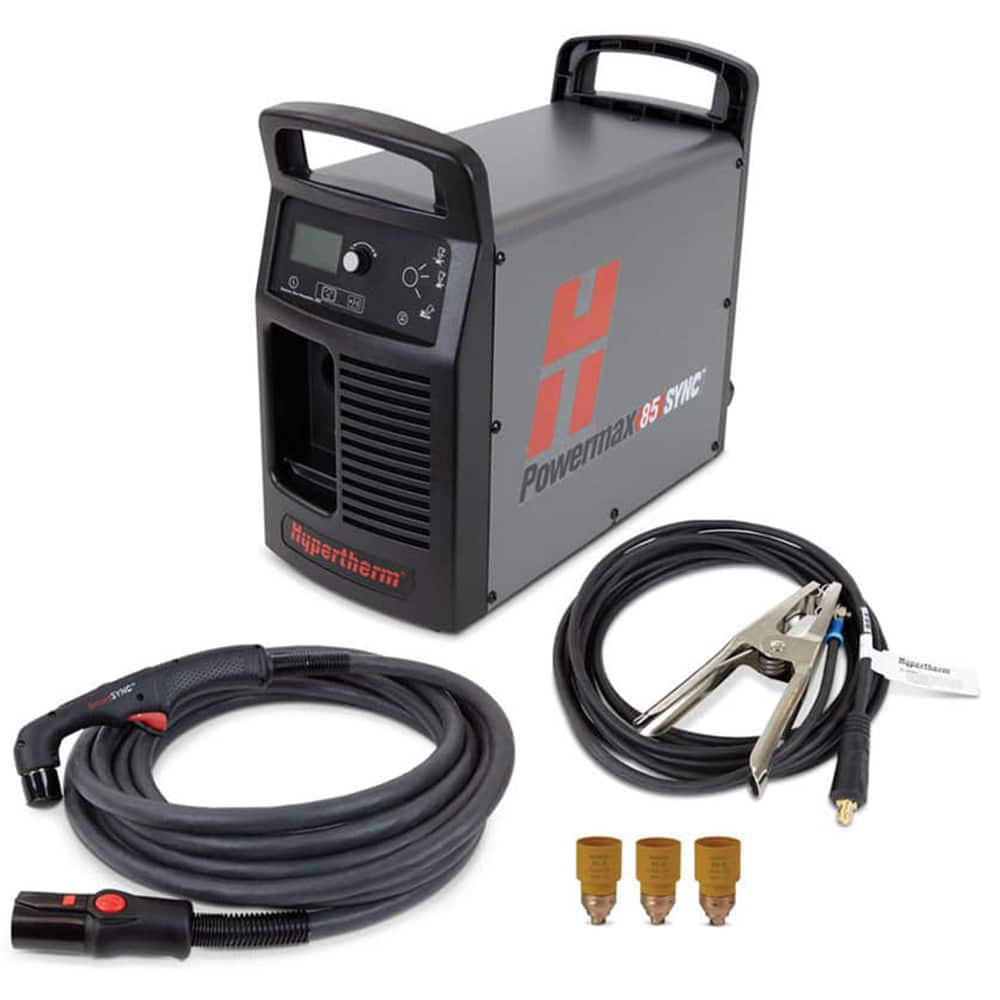 The Hypertherm® Powermax85 SYNC®, with CPC Port, Voltage Divider and 75 degree SmartSYNC™ handheld torch, is an 85 amp plasma cutter that is ideal for cutting mild steel up to 1 inch thick.
