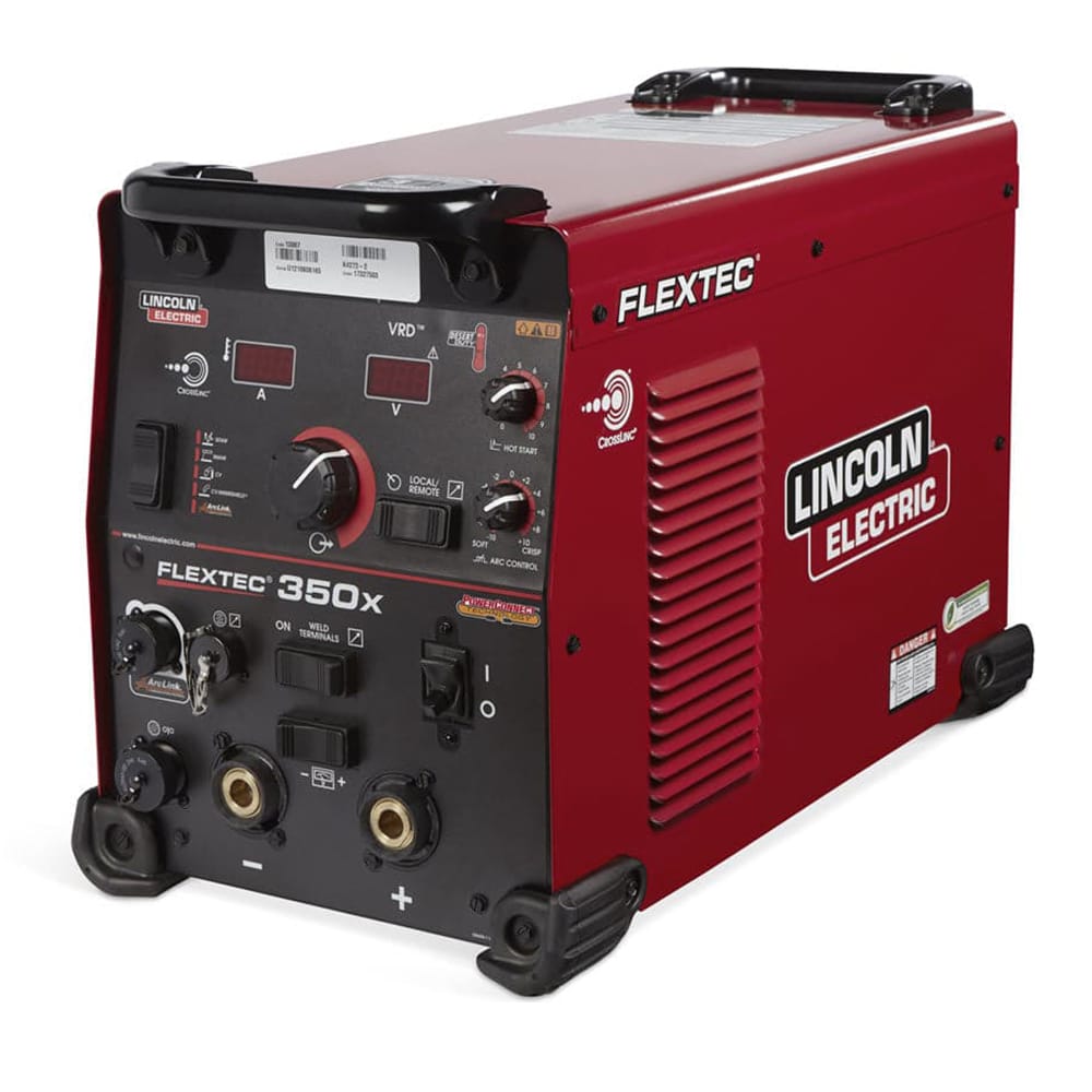 The Lincoln® Flextec® 350X PowerConnect® K3443-2 is a 350 amp multi-process welder that operates on 200-575 volt, single or three-phase input power. The PowerConnect feature allows the welder to automatically detect any input power type – regardless of voltage or phase. It then optimizes the 350X to run on the supplied input electricity without any manual linking or switching. The Flextec 350X PowerConnect is capable of MIG, Pulsed-MIG, Flux-cored, DC TIG and Stick welding.