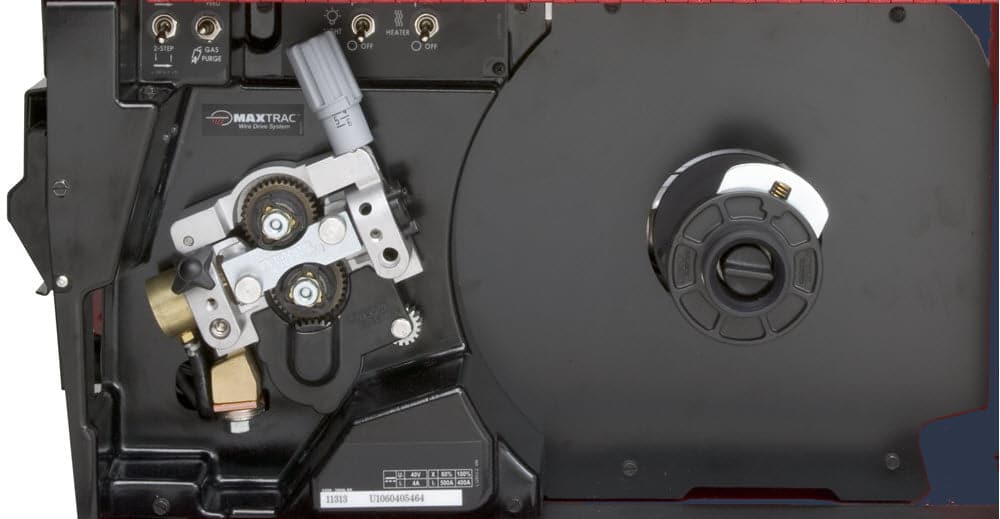 The Power Feed 25M accepts both standard MIG/Flux-Cored guns, as well as Lincoln’s Magnum PRO® AL push-pull guns. Magnum PRO AL push-pull guns work in tandem with the 25M to provide superior aluminum MIG welding results at extended distances from the feeder. The 25M features Lincoln’s MAXTRAC® wire drive system, to ensure smooth wire feeding and excellent electrical contact with your welding gun. A unique heat switch inside the feeder case reduces moisture to help protect consumables in harsh welding environments. An internal case light dramatically improves visibility while changing guns, drive rolls or welding wire.