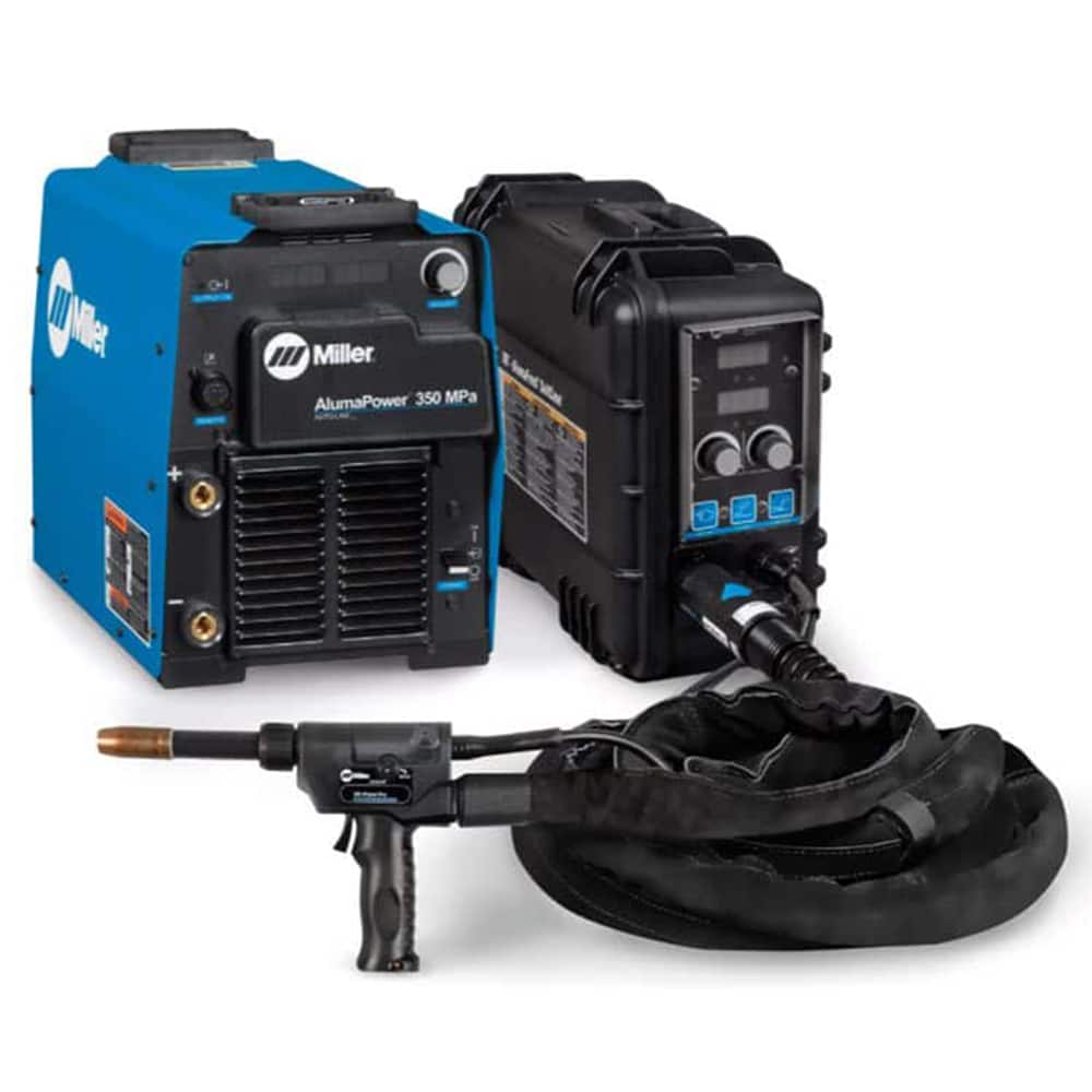 The Miller® AlumaFeed™ 350 with XR™-Pistol 25 ft. Air-Cooled Push-Pull Gun is a 425 amp MIG welding package that is specifically designed for pulsed MIG welding of aluminum. The XR-AlumaFeed™ Suitcase® wire feeder and AlumaPower™ 350 MPa produce aluminum MIG welds that rival the quality and appearance of TIG welds. Built-in MIG and pulsed MIG welding programs allow for easy set up of weld parameters for a variety of welding wires. (Built-in Pulsed MIG programs are available for aluminum MIG wire ONLY)
