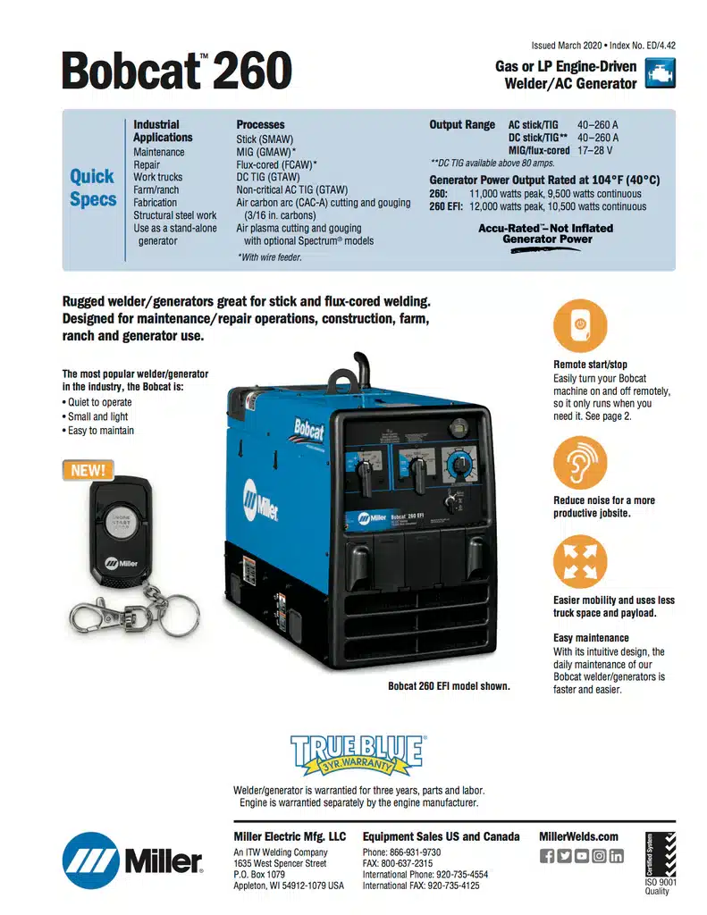 The Bobcat 260 welder / generator has Remote Start/Stop technology! Take control and eliminate unnecessary noise. Easily turn your Bobcat machine on and off wirelessly. Stop running the unit when you don’t need it. Get more work done with every tank of fuel, extend the time between maintenance and work in comfort, with the hassle of walking back and forth to your machine.