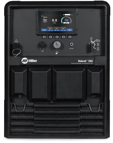 The Miller® Bobcat™ 265 engine driven welder with battery charger/crank assist is a 265 amp DC welder and 11,000 watt AC generator that can also charge and jump start dead batteries when paired with OPTIONAL #300422 charging cables.