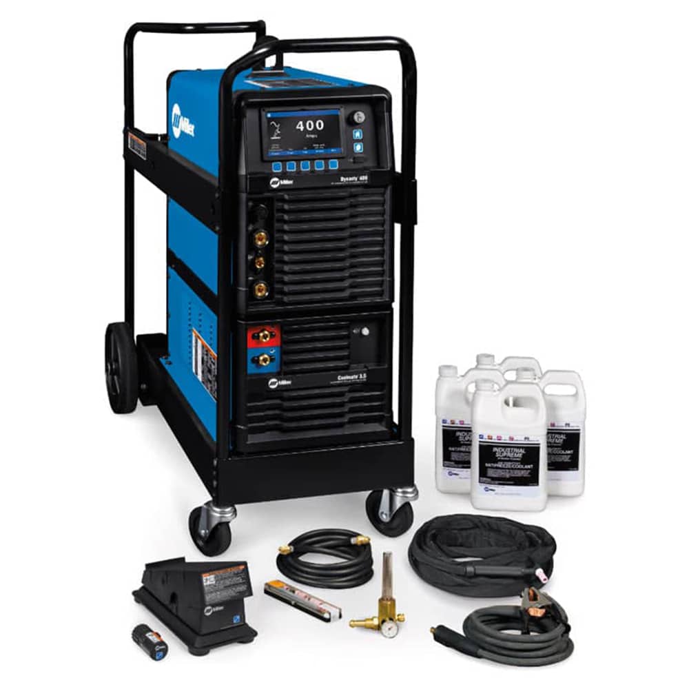 The Miller® Dynasty® 400 Wireless Complete is an industrial 400 amp AC/DC TIG welder package that comes complete with wireless remote amperage foot control, TIG torch with accessories, water cooler with 4 gallons of coolant, shielding gas regulator with hose, and running gear with cylinder rack.