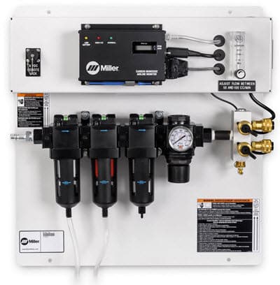 The BreatheAir 4 Person Panel filtration system is a stationary, wall-mounted system and weighs 45 pounds. When teamed with the Miller Supplied Air Respirator with C50 regulator (SOLD SEPARATELY), the operator can enjoy Grade D breathing air under the hood at temperatures up to 50 degrees F cooler than the surrounding environment.